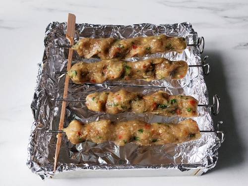 4. Cover and refrigerate for a minimum of 30 minutes to 4 hours (if made without fresh onion). Do not skip this step. If using wooden skewers, soak them in water for 30 mins & pat dry very well. or simply cover the edges with foil, to prevent burning.