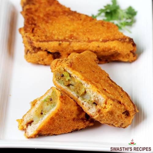 Bread Pakora is a fried snack of potato sandwich. These pakoras are stuffed with a spiced potato mixture. However if you want you may simply make plain bread pakora without stuffing.