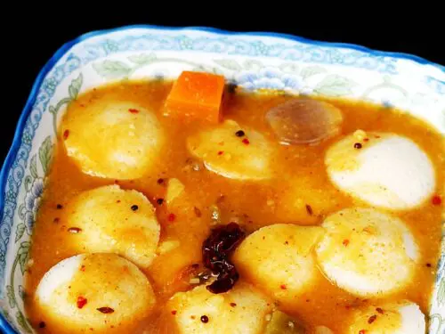 Drumstick Sambar is a South Indian traditional stew made with lentils, spices and vegetable drumsticks. This spicy, thick, tangy and delicious stew is eaten with rice and ghee alongside papads or a vegetable stir fry. While the traditional Sambar has mixed vegetables this one uses only the vegetable drumsticks and small onions/shallots. In this post I share my Mom’s recipe to make Drumstick Sambar.