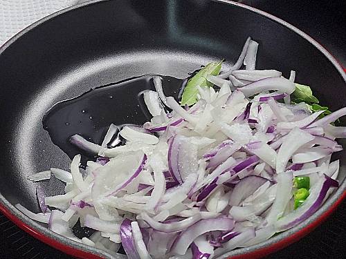 3. Pour oil to a wide pan and add onions, chilies, curry leaves and salt.