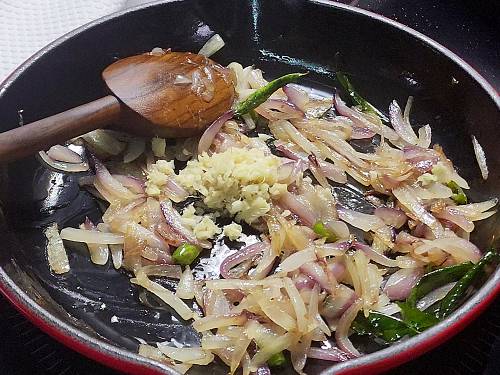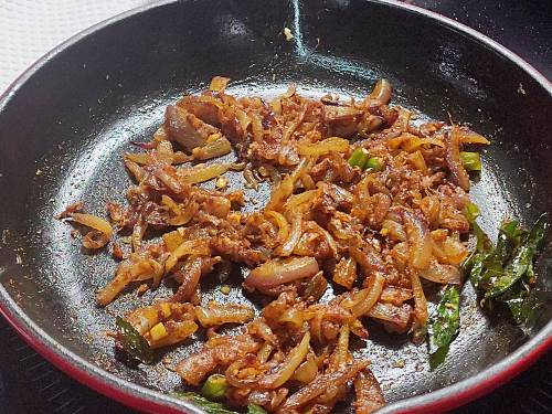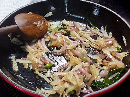 - Heat oil in a wide pan and add onions, green chilies, curry leaves chilies and salt. Saute on a medium heat for until golden and evenly caramelized.