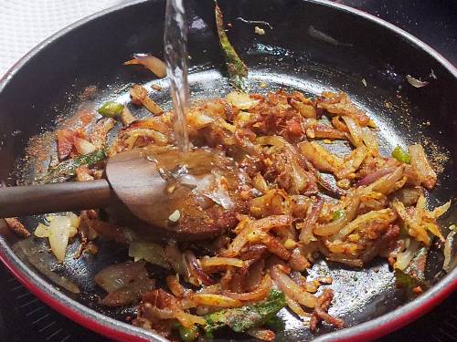 7. Immediately pour 2 tablespoons water to deglaze. This also helps the spices adhere to the onions.