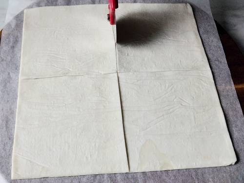 11. I prefer to work over a parchment paper directly so it is easier to pull it over the baking tray later. Cut the puff pastry sheet to 4 portions.
