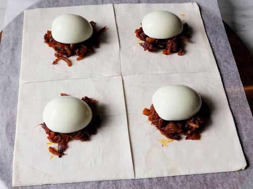 - Place 1½ to 2 tbsps. of onion masala in the center of each cut puff pastry. Place a halved egg, (yolk facing the onions) on each pastry. If your pastry is too dry, you can brush the corners with little water.