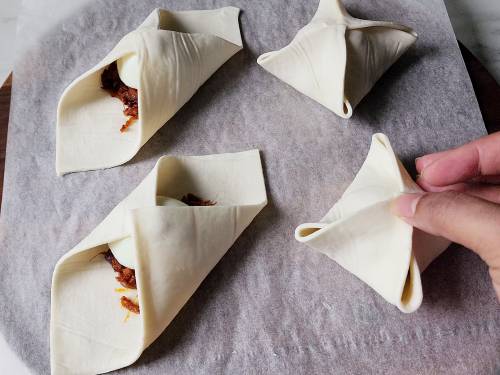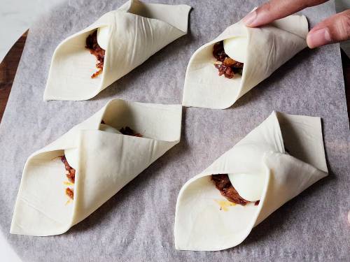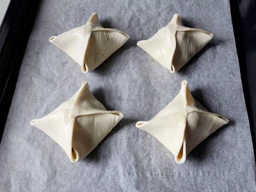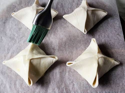 12. Place 1½ to 2 tbsps of filling in the center of each cut pastry. Place the egg, yolk touching the onions. If your pastry sheets are too dry you may brush the corners with little water. I don’t do that.