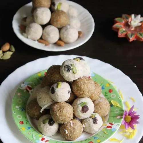 Ragi Ladoo are delicious wholesome festive treats made with ragi flour, nuts, jaggery and ghee.