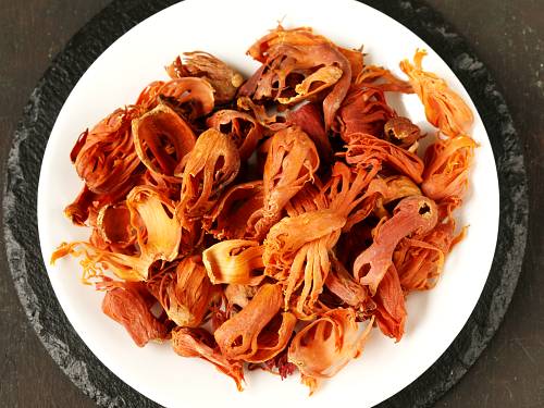 Mace is the outer covering of nutmeg, this lacy reddish covering has a milder and sweeter taste than nutmeg. It is typically used in small quantity in garam masala and in Mughlai dishes.