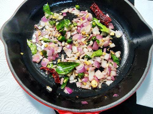 - Saute for a minute and add onions and green chilies. Saute for 4 to 5 mins until transparent.