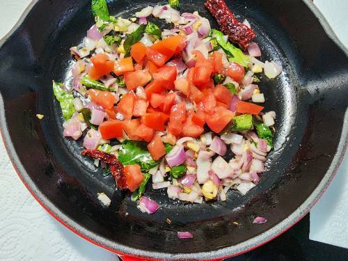 - Add tomatoes and salt. Cook until the tomatoes breakdown and lose the raw smell. Takes about 5 to 6 mins.