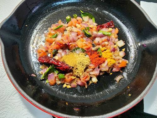 8. Add the ground spices. You can either add sambar powder or curry powder or use the below spices