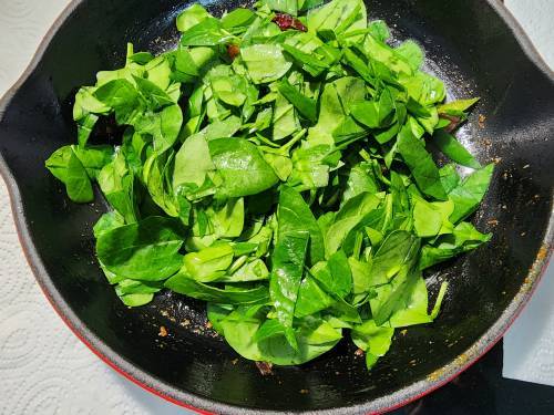 11. Saute until wilted for 4 to 5 mins. If you are using more mature greens, cook them down until soft for a little longer. They won’t actually cook much after adding the dal.