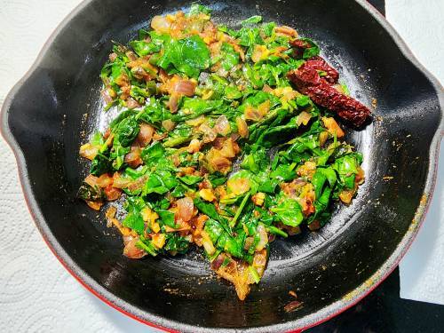 - Stir in the ground spices – red chili powder, turmeric, coriander and cumin powder. Add the chopped keerai and cook down until wilted. It takes me only 4 to 5 mins but this varies depending on the kind of greens you are using.