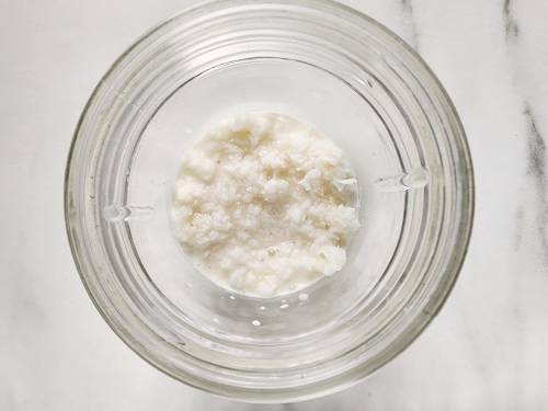 12. Meanwhile, add ¼ cup raw grated coconut and ¼ cup water to a grinder. (If using unsweetened shredded coconut, soak ¼ cup in ¼ cup boiling hot water until soft, about 15 to 20 mins. Add to the grinder and pour ¼ cup full fat milk.)