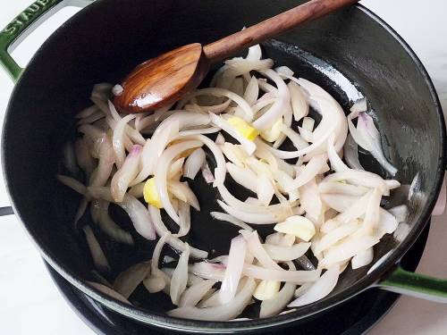 - Heat oil in a pan. Add cardamoms, sliced onions, ginger and garlic. Saute until transparent for about 4 to 5 mins. Do not brown them.