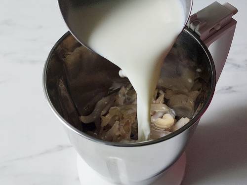 - Soak cashews in half cup hot water until needed later.