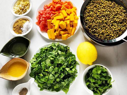 - Mung Beans are the star ingredient here. Use the whole mung beans and avoid split or skinned versions of the same in this recipe because the texture & flavor of the soup would be different. You may use Sprouted Mung Beans too or Brown Lentils (whole masoor) or green lentils (puy or French green lentils) but the liquid needed and the cook time changes. So adjust accordingly.
