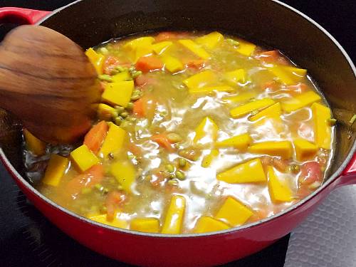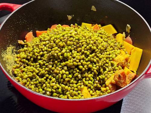 7. Pour 4 cups water or stock. Bring to a rolling boil and reduce to medium. Cook partially covered, until the mung beans are tender.