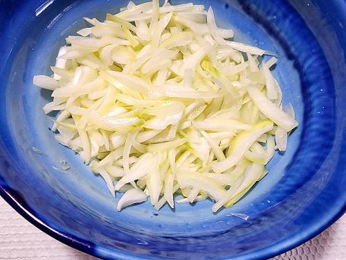 - Slice onions thin, of uniform thickness and add to a large mixing bowl. Add salt and mix well, squeezing gently to release the juices. Rest aside for a minimum of 15 to 20 mins, while you prepare the rest.
