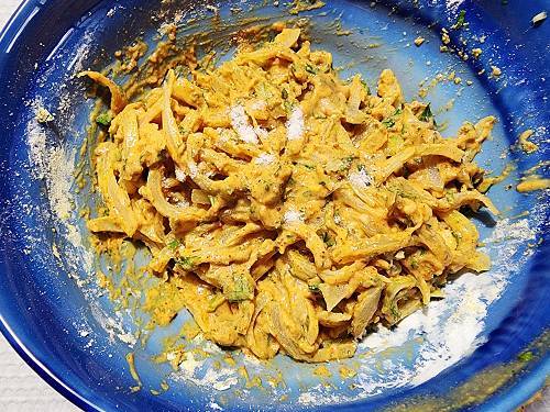 8. Mix together to coat the onions with all the dry ingredients evenly, to form a super thick batter of dropping consistency. If it is too dry and crumbly, add 1 tablespoon water and mix. You won’t pour a lot of water at one time. If your onions are super juicy, you may not need water at all.