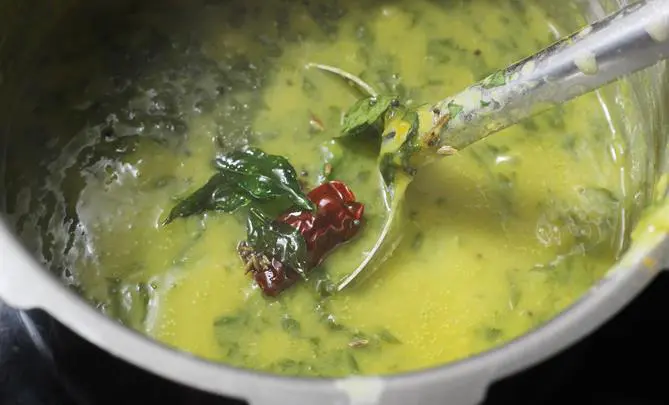 - When the pressure drops, open the lid and add the chopped palakura. Let cook until it wilts completely. Stir in tamarind water, turmeric and salt. Mash it slightly. If your pappu is too thick pour little hot boiling water to bring to a consistency.