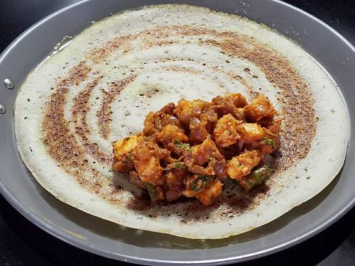 - Scoop out ¼ portion of the prepared paneer to one half of the dosa. Cover it half way and remove to a serving plate.
