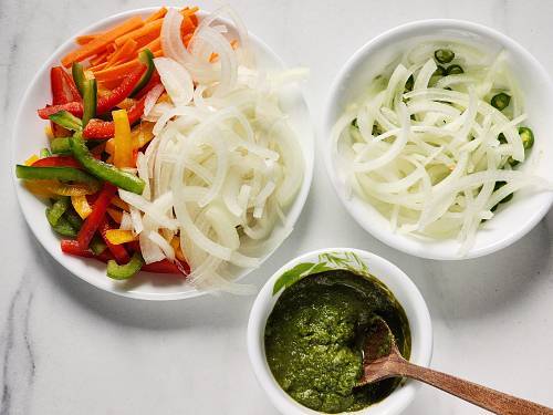 - When you are ready to make the Paneer Kathi Rolls, slice onions, chilies, carrots and bell peppers thinly.