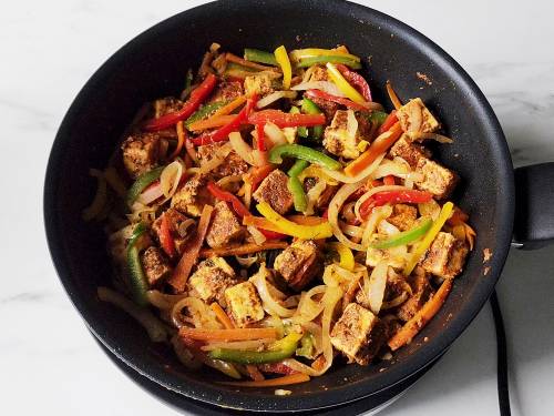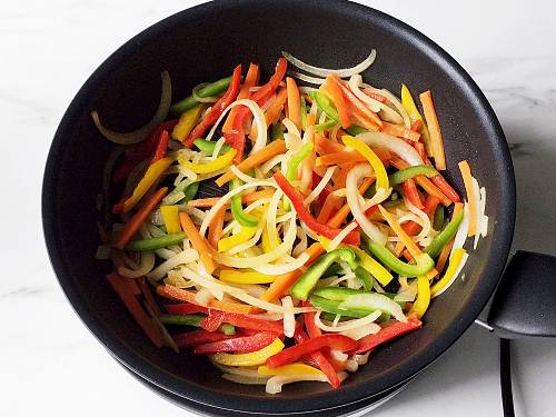 - Heat oil in a skillet and add the onions, carrots and bell peppers. Sauté them on a high heat until they lose the raw flavor, for 3 to 4 mins. Remove them to a plate.