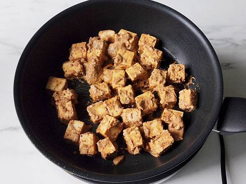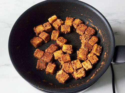 - Add the marinated paneer to the same hot pan and spread them in a single layer. Let cook until the marinade no more tastes raw, for about 4 to 5 mins, stirring half way.