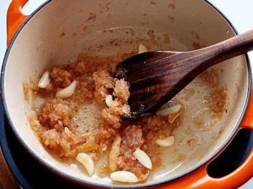 - Heat oil in a deep pot and saute onions on a medium heat for 10 minutes. Add the ginger and garlic and continue to saute on a low heat until deep golden (caramelized) but not burnt.