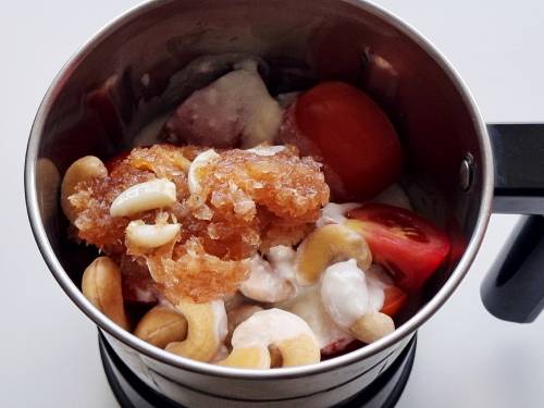 - Cool this and add to a blender along with tomatoes, soaked cashews and curd. Make a smooth paste.