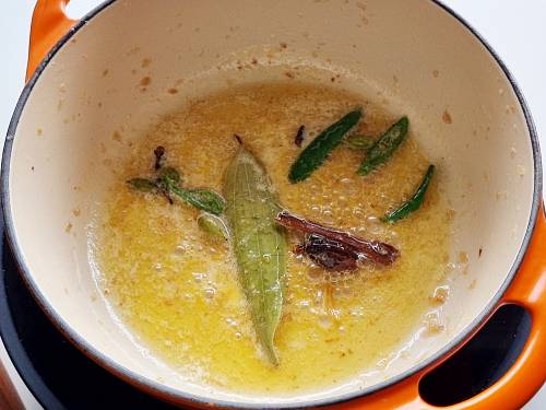 - Add butter to the same pot and heat it on a low heat. Add the whole spices – bay leaf, mace, cinnamon, cloves, green and black cardamoms and green chilies.