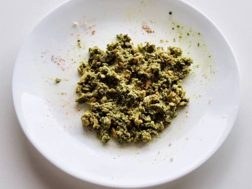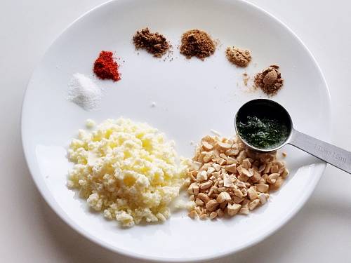 - Mix together the crumbled paneer with salt, coriander chutney, chopped cashews, red chili powder, amchur, garam masala and dried ginger. Taste test and add more spice to your taste. The mixture has to be moist.