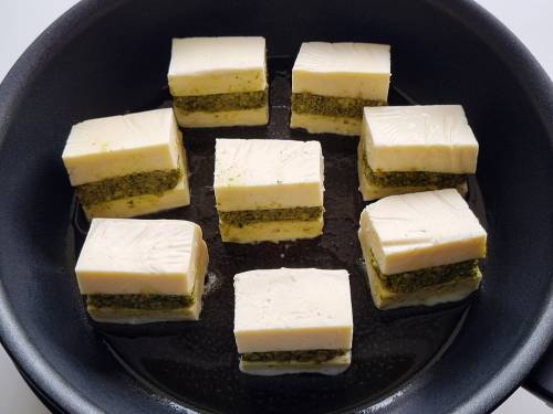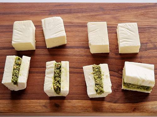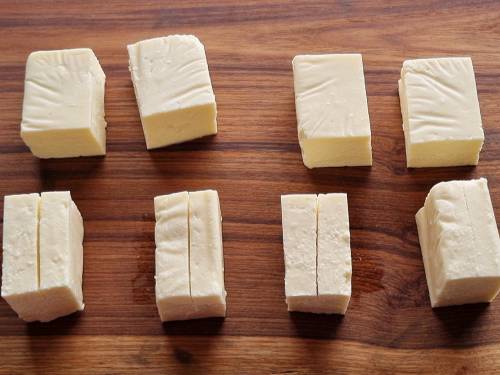 12. I am using 2 blocks of rinsed paneer here (200 grams each). You can also use 1 large block. Trim the sides of each block to make it perfectly shaped. From the 2 blocks you will get about ¼ cup (35 to 40 grams) crumbled trimmings (see picture below), which we are going to use for the stuffing. Dice each block to 4 portions. You will have 8 portions from 2 blocks. Make a slit carefully, keeping the base of the piece intact (on one side). You don’t need 2 slices but a slit on 1 portion, so we can stuff in there.