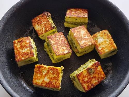 - Heat a pan with ghee or oil and place the paneer sandwiches. Fry them on a medium to medium-high heat until golden, using a wooden tong or 2 spatulas, hold the paneer sandwiches and turn them to the other side.