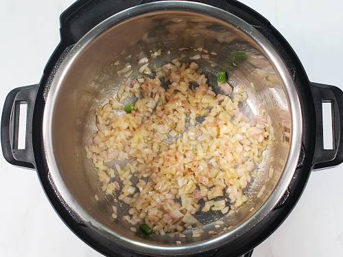 - Press Saute button and pour ghee to the steel insert. When the ghee melts, add cumin seeds, bay leaf, chopped onions, green chili and salt.