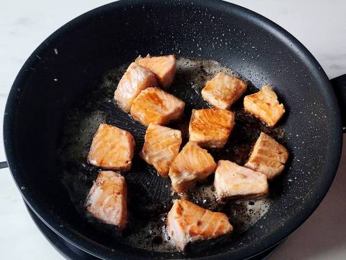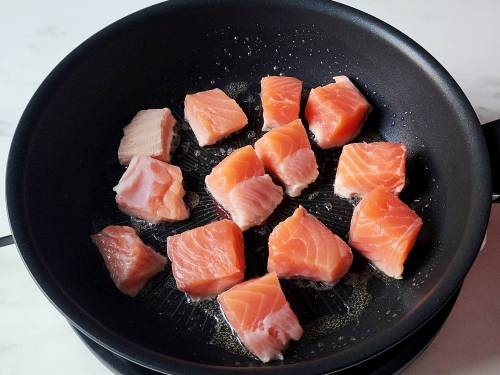 - Pat dry the salmon cubes. Heat a non-stick pan with oil and spread it all over the pan. Place the salmon cubes (with the skin side down if it has skin).