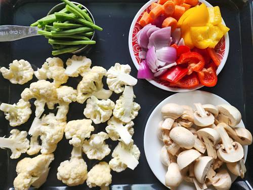 12. Meanwhile add the bell peppers, onions,carrots and green beans to another prepared tray. Drizzle with the rest of the spice mix and coat them well. Place this in the bottom rack during the last 10 mins (10 mins after the cauli & mushroom are placed in the oven).